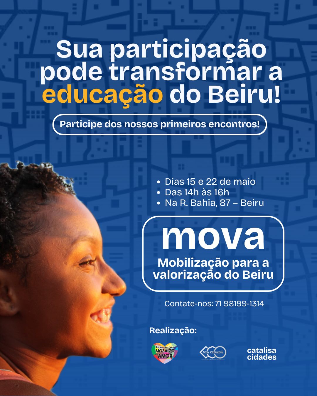 A primeira ação do MOVA será a realização de duas oficinas de educação cidadã, programadas para o próximo mês. Os encontros pretendem estimular o protagonismo social e o debate sobre o desenvolvimento do território. Em seguida, será realizado o 1º Fórum Popular de Educação do Beiru, reunindo moradores, representantes do poder público, lideranças locais e estudantes para definir propostas concretas de melhoria para o bairro.